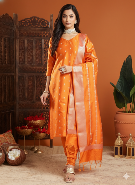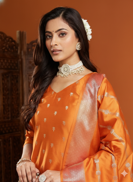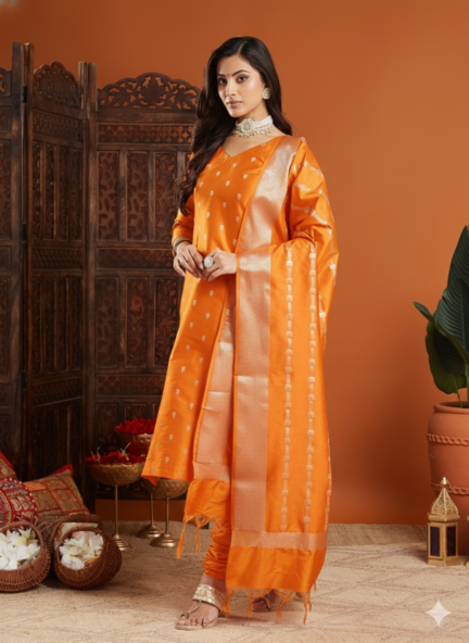 इस आर्ट सिल्क सूट सेट में कुर्ते और दुपट्टे पर सोने की ज़री का काम किया गया है, दुपट्टे को लटकनों से तैयार किया गया है।