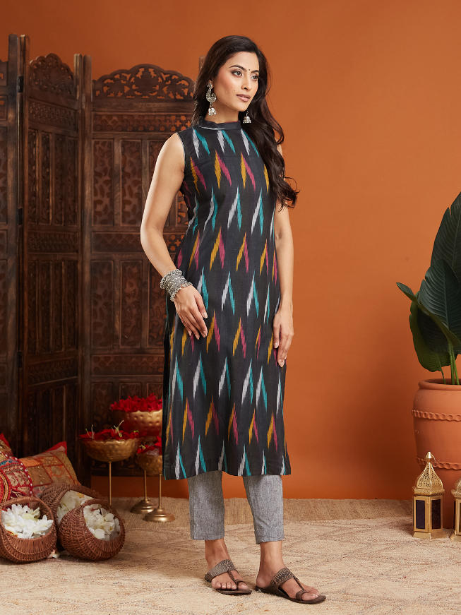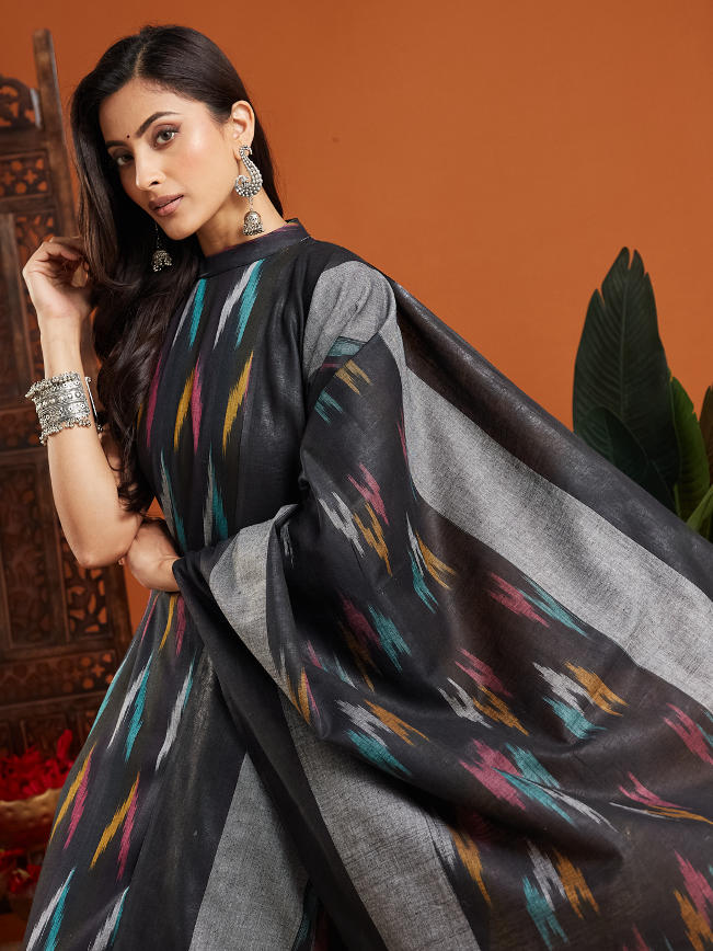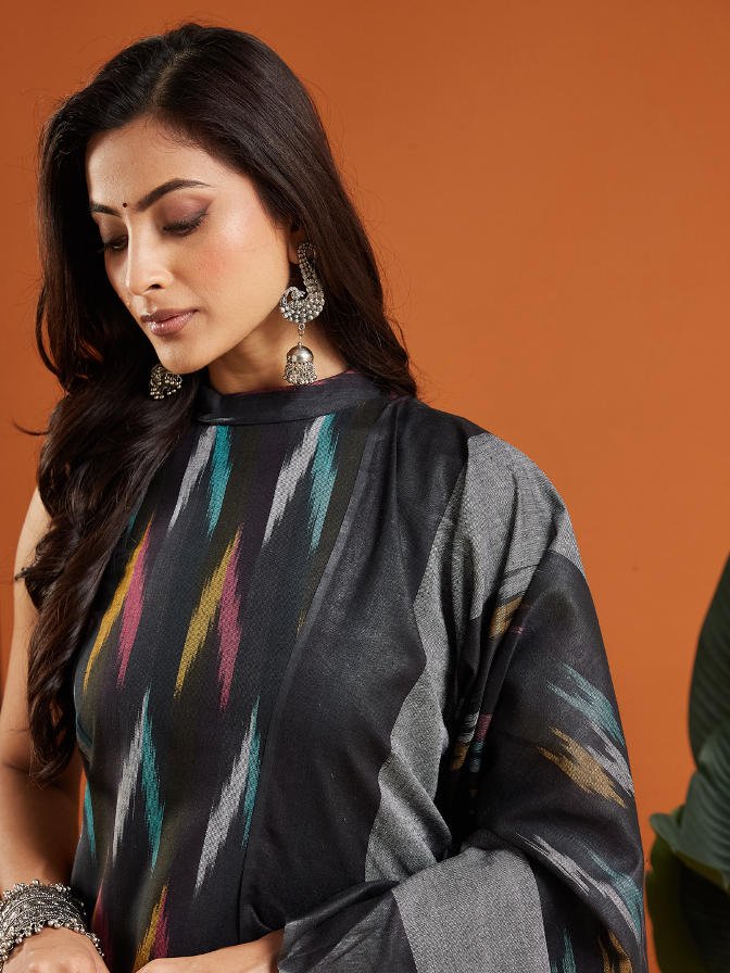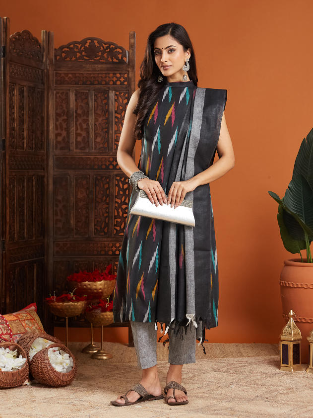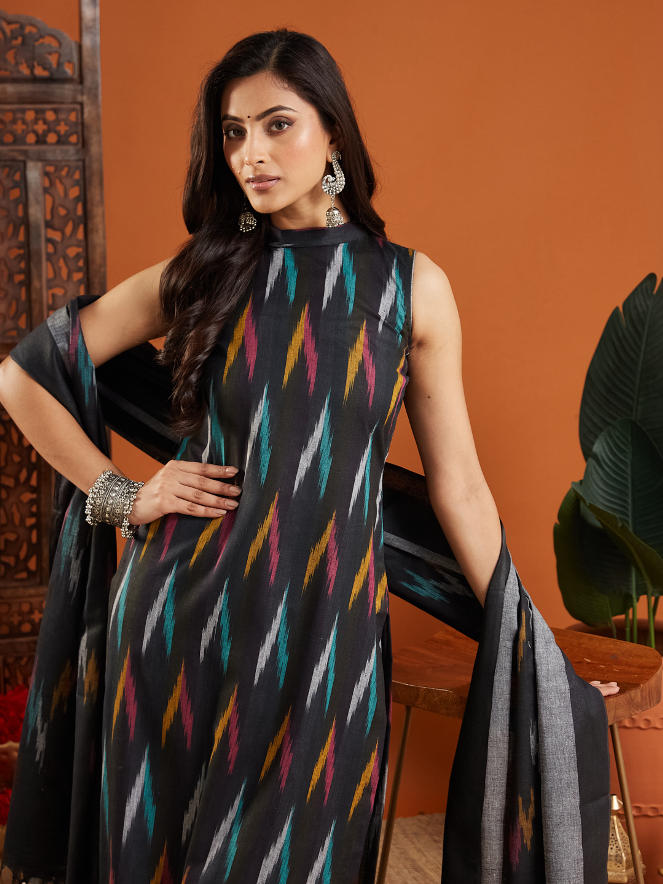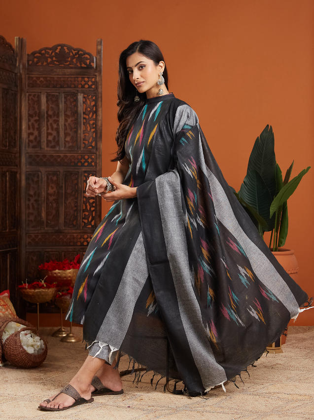 इस सलवार सूट में स्टैंड कॉलर नेकलाइन है और इसे स्ट्रेट पैंट के साथ पेयर किया गया है। इस लुक को ज़री से जड़ा एक खूबसूरत कंट्रास्टिंग हैंडलूम सिल्क दुपट्टे से पूरा किया गया है, जिस पर लटकन की फिनिशिंग की गई है।