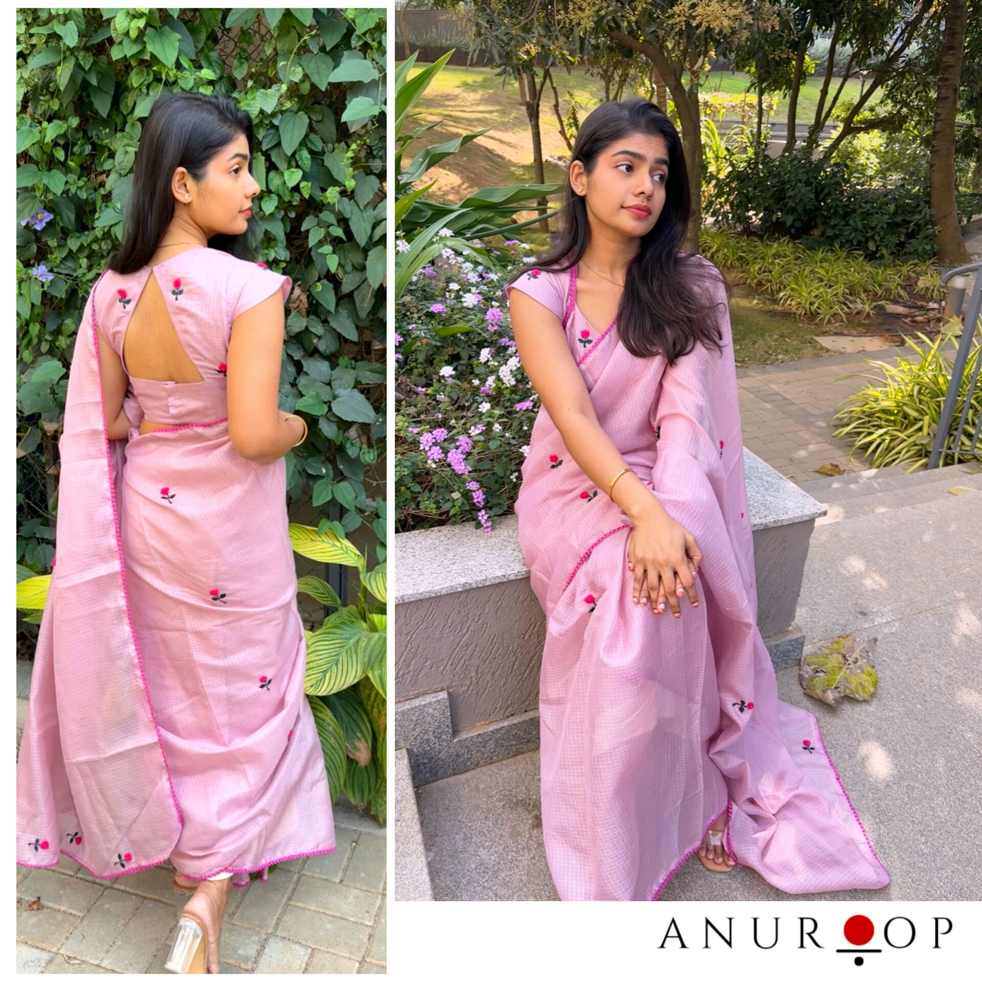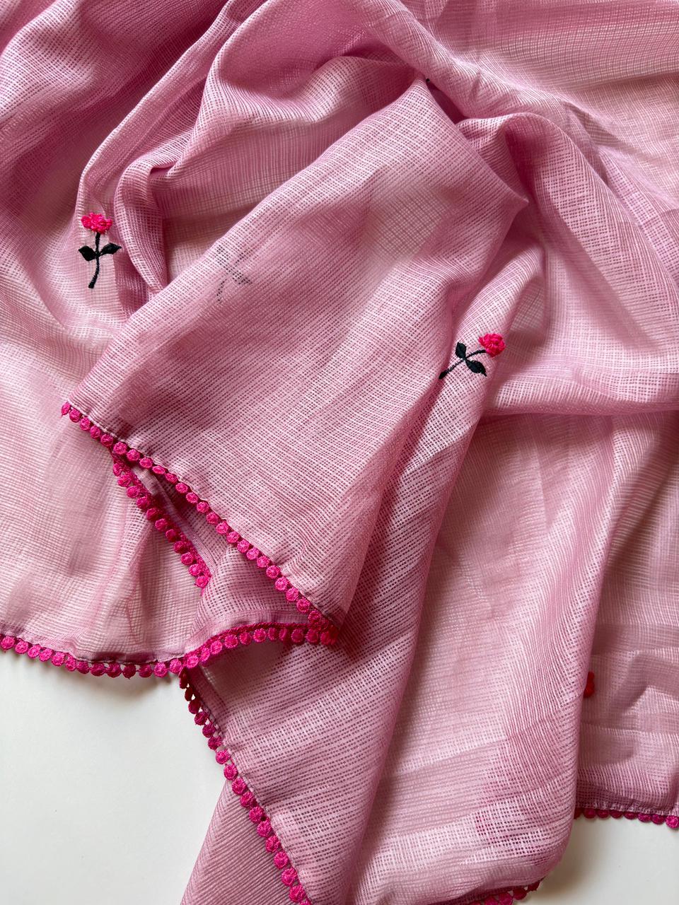 This stunning kota saree has a floral motif runnning throughout the blouse, the saree is double shaded and has been finished intricate lace. It comes with a boat neck princess cut blouse that looks perfect anf closed back with a small keyhole opening.