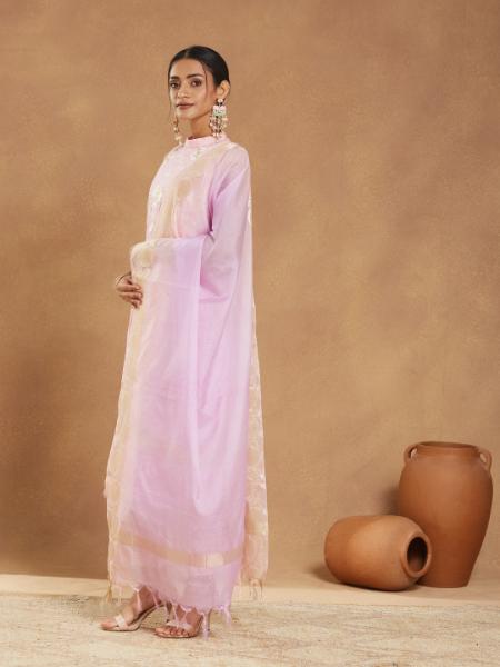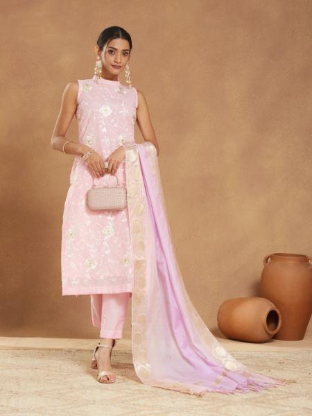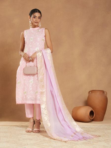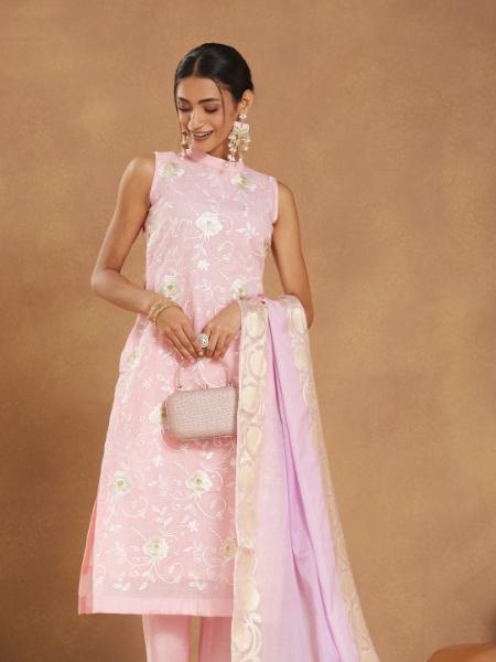इस सलवार सूट में हाई नेकलाइन वाला कढ़ाईदार बेबी पिंक कुर्ता और स्ट्रेट पैंट है। इस लुक को बनारसी ज़री बॉर्डर वाले कंट्रास्ट लैवेंडर दुपट्टे से पूरा किया गया है, जिस पर लटकन की फिनिशिंग की गई है।