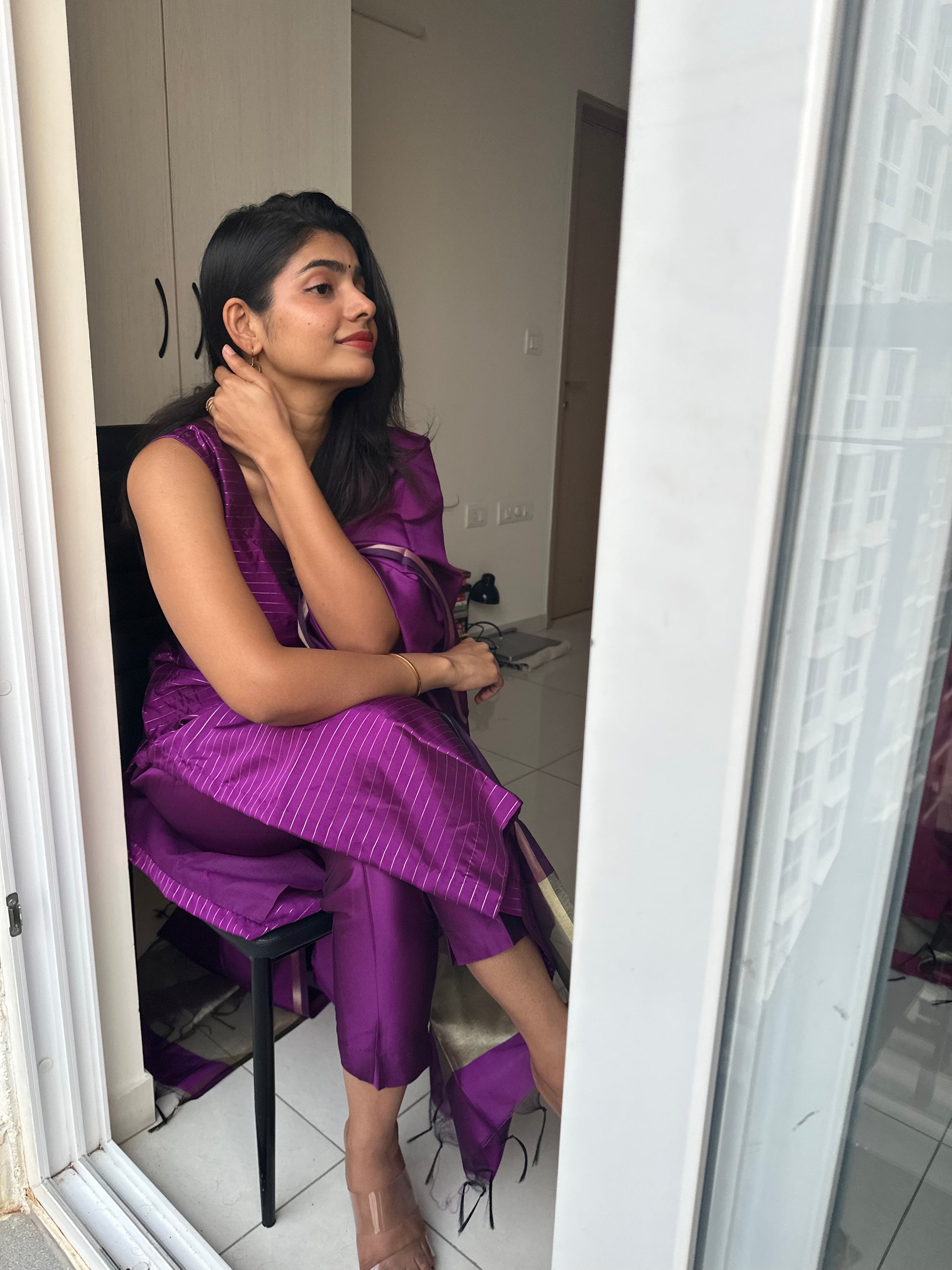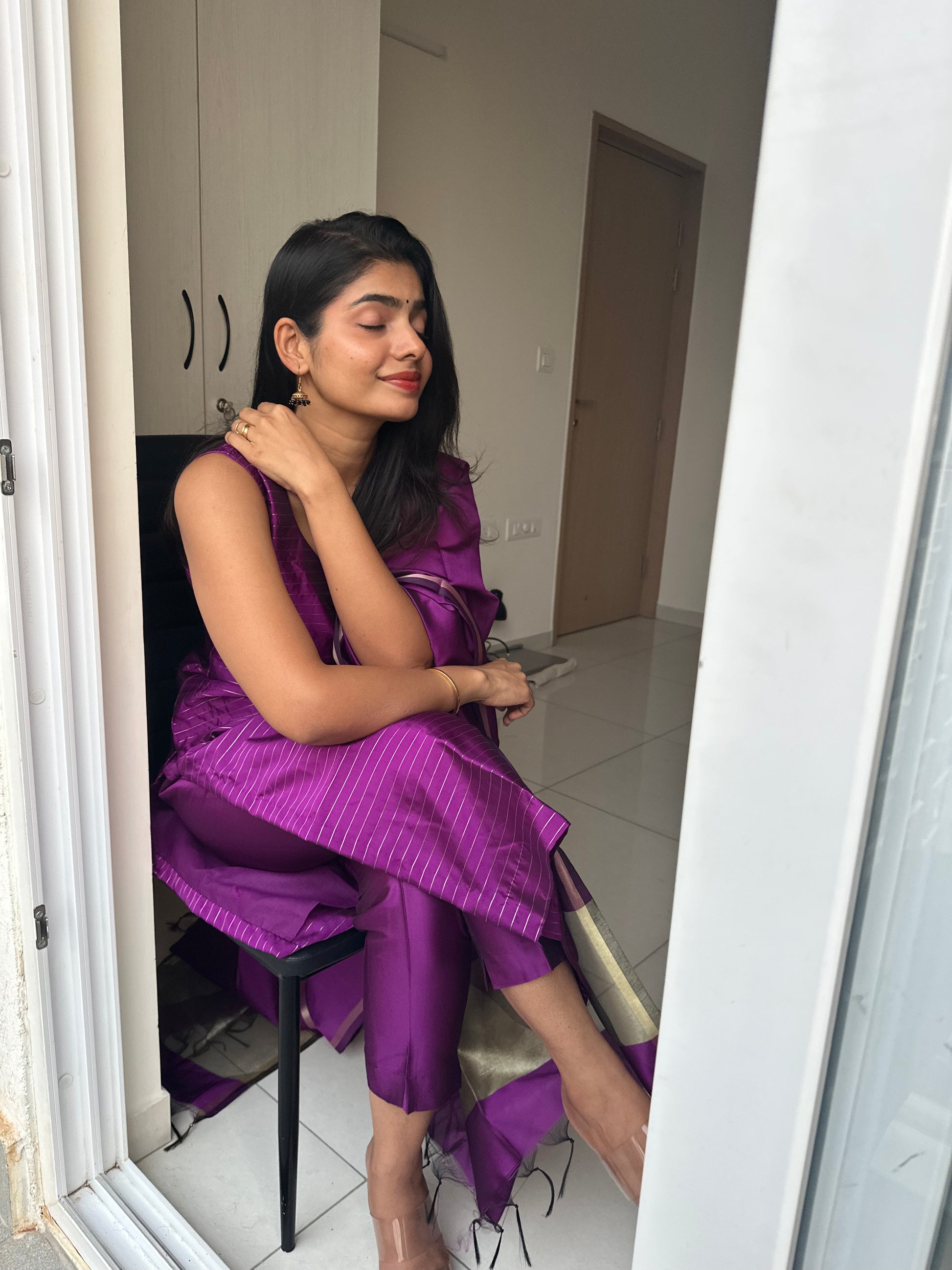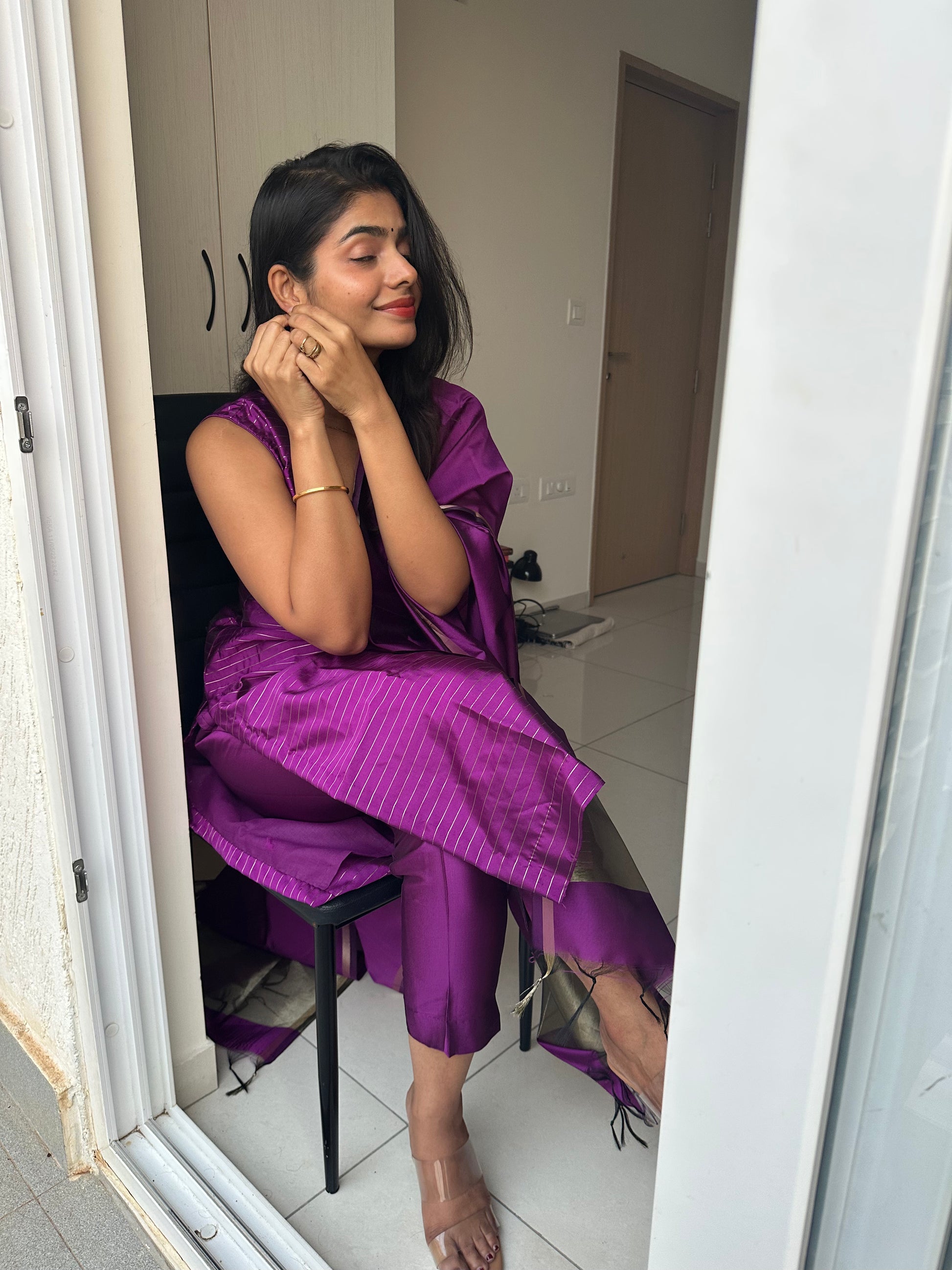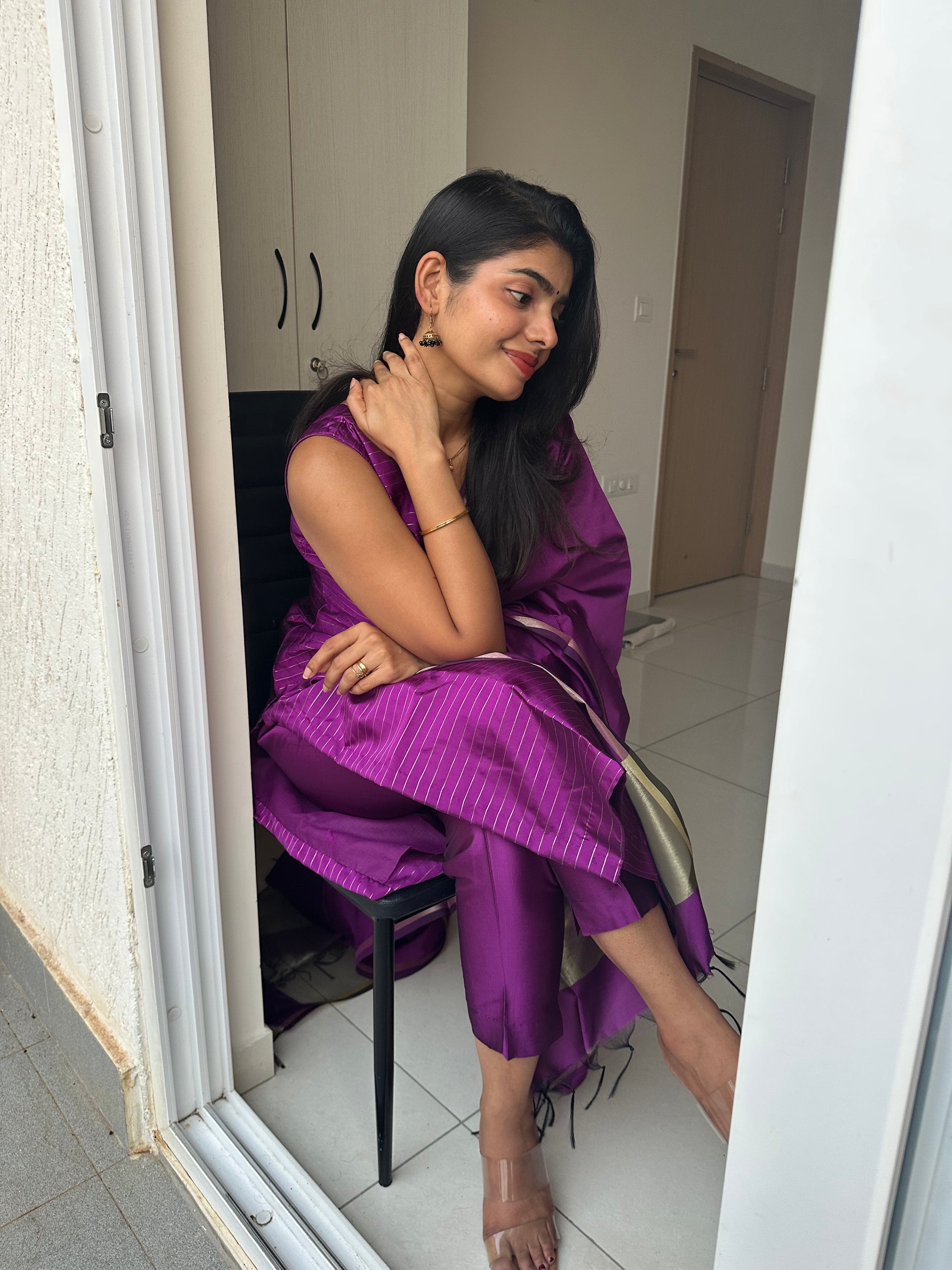 This salwar suit features a V neckline paired with straight pants. The look has been completed by addition of an elegant silk dupatta with zari border that has been finished with tassels.