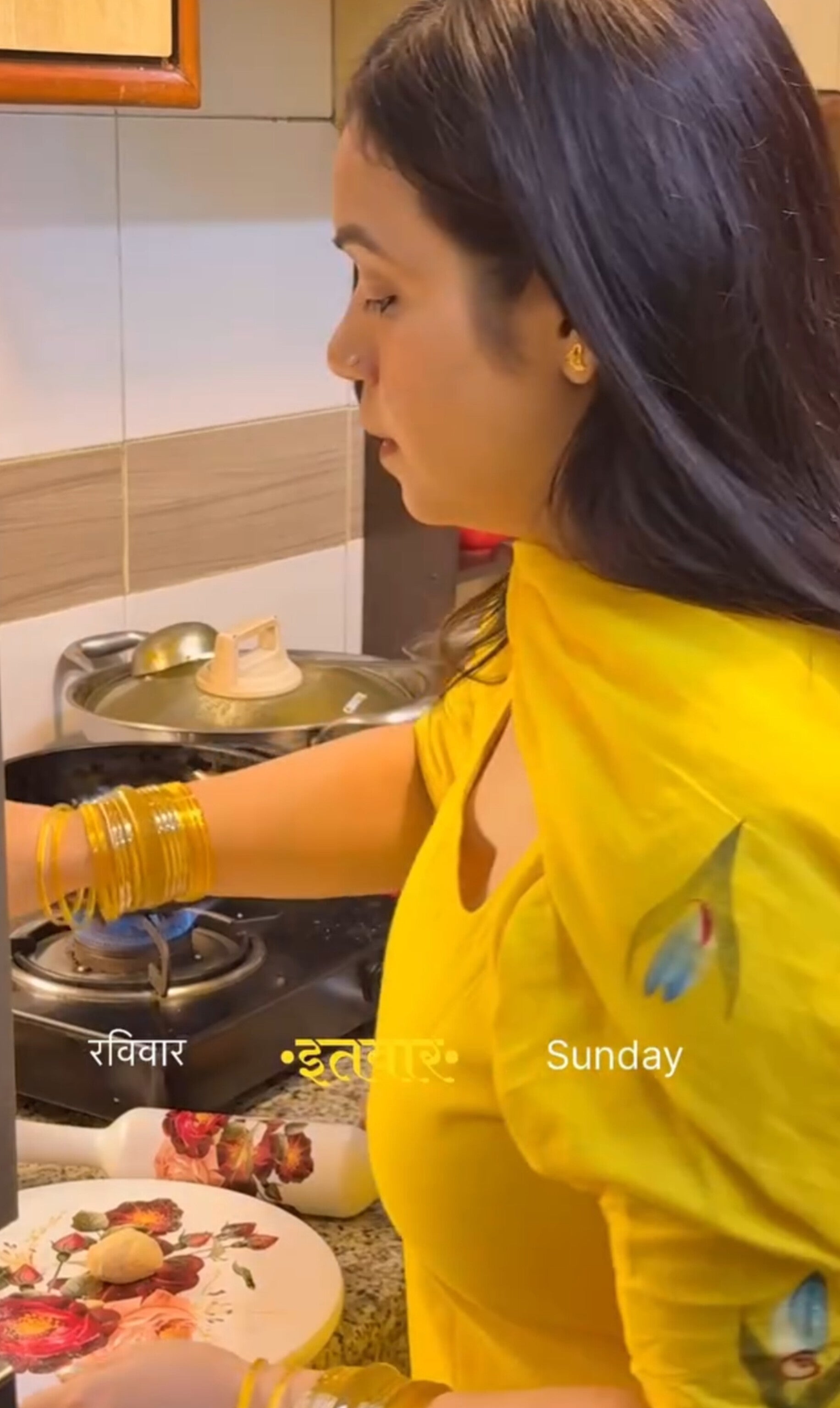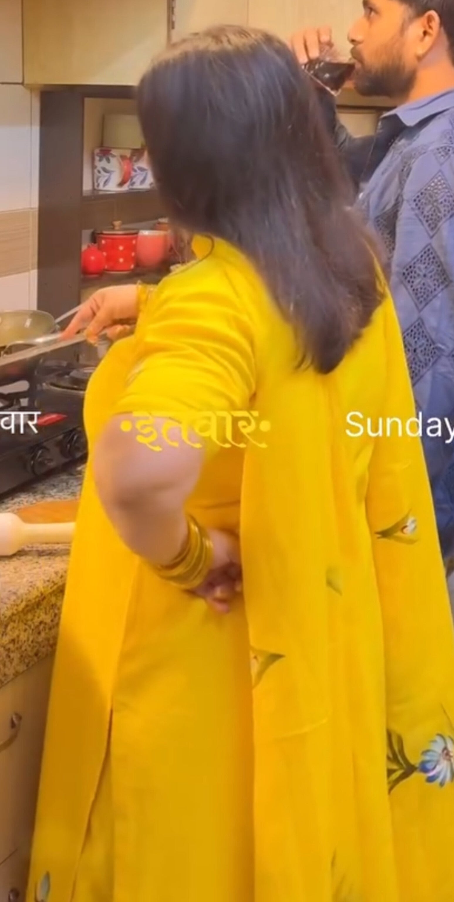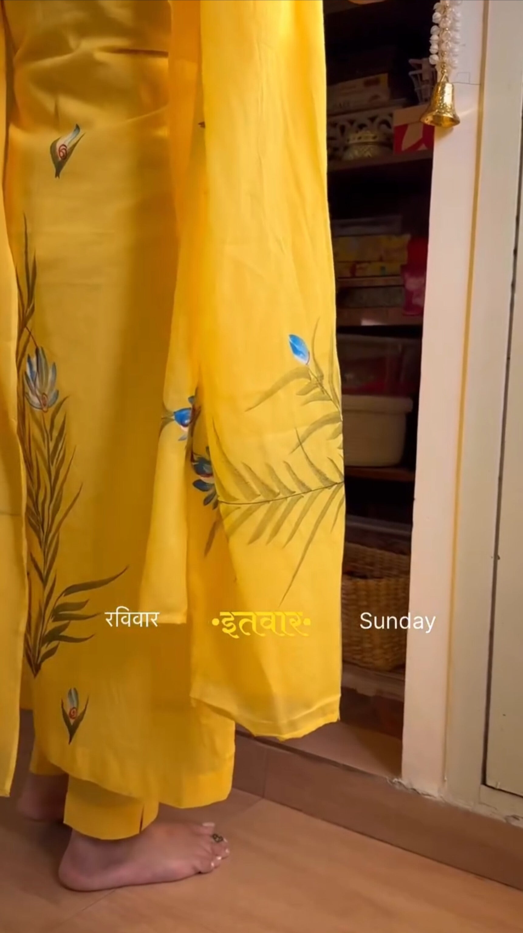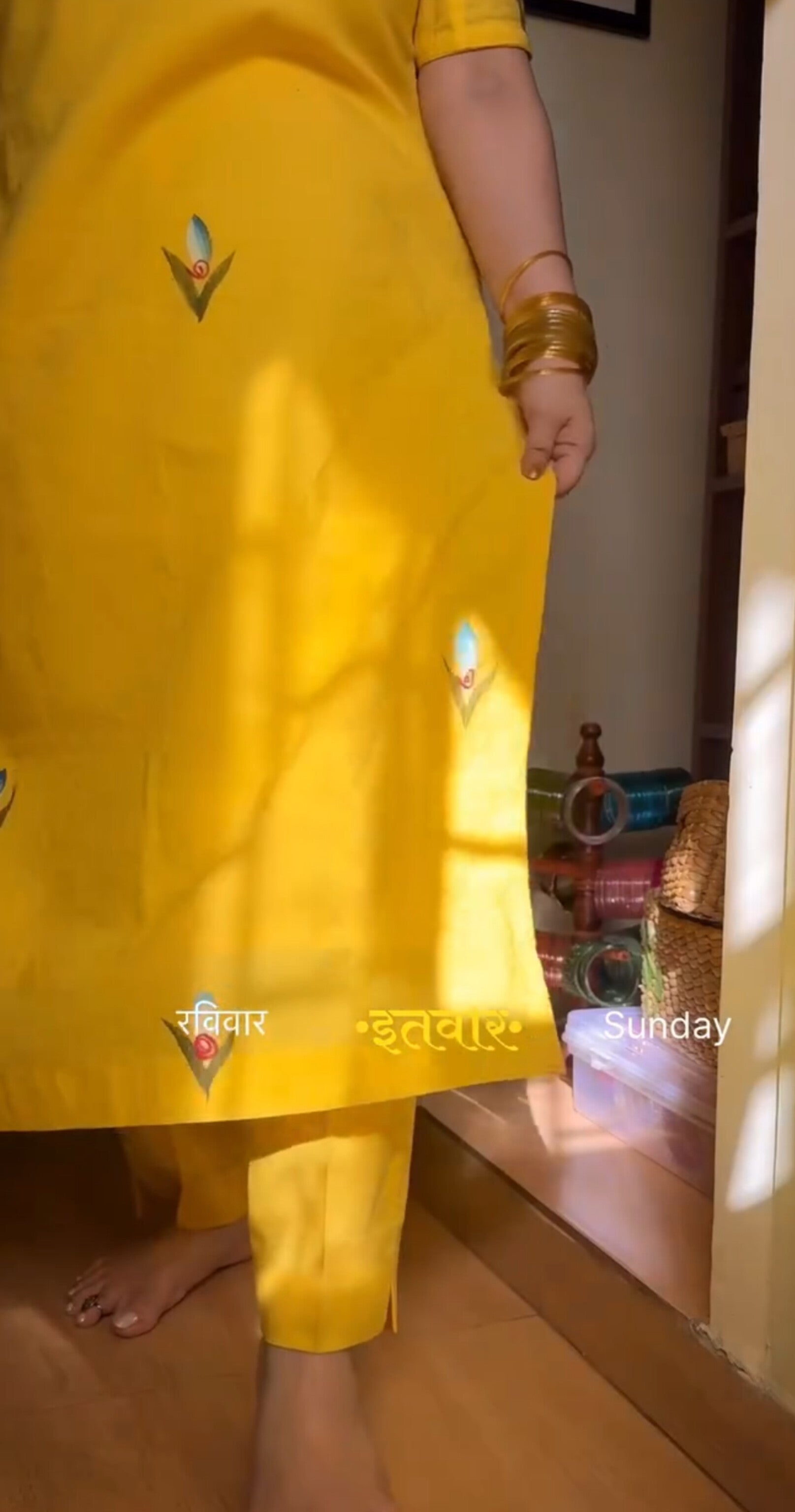 This yellow hand painted salwar suit features round square neckline paired with straight pants. The look has been completed by addition of a hand painted cotton dupatta.
