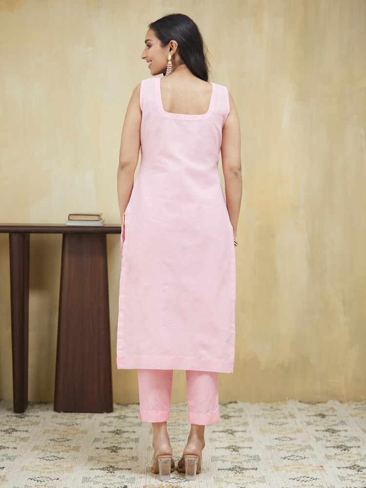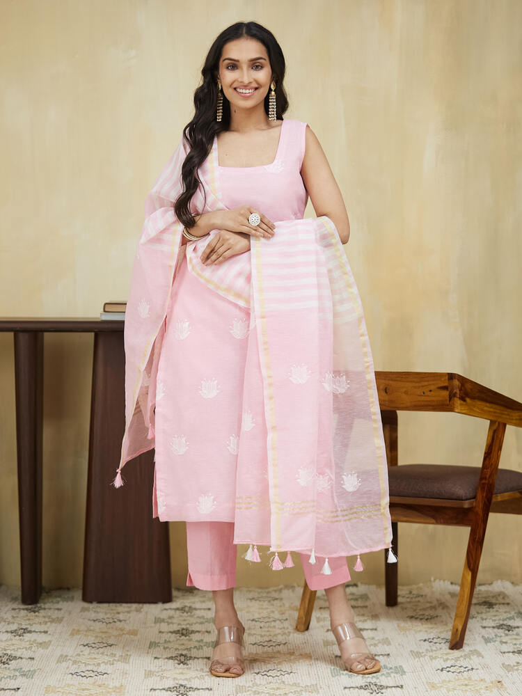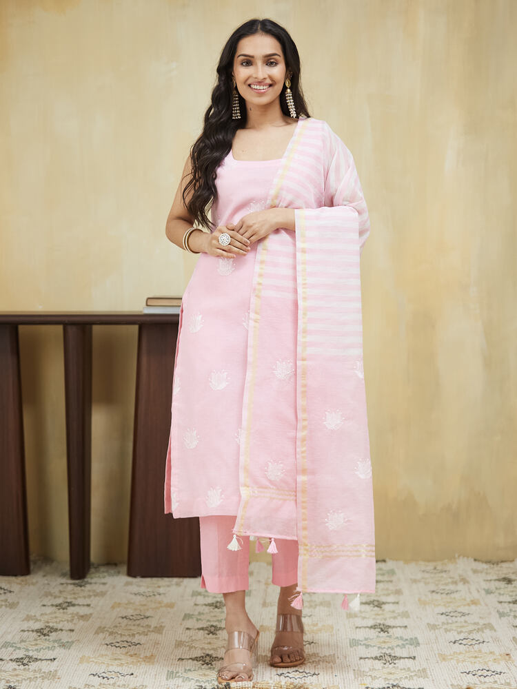 This baby pink embroidery salwar suit features U neckline paired with straight pants. The look has been completed by the addition of an embroidered dupatta finished with tassels.