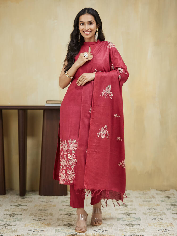 This dark pink salwar suit features a high collar neckline paired with straight pants. The look has been completed by the addition of an elegant dupatta finished with tassels. The embroidery has been done using cream resham threads.