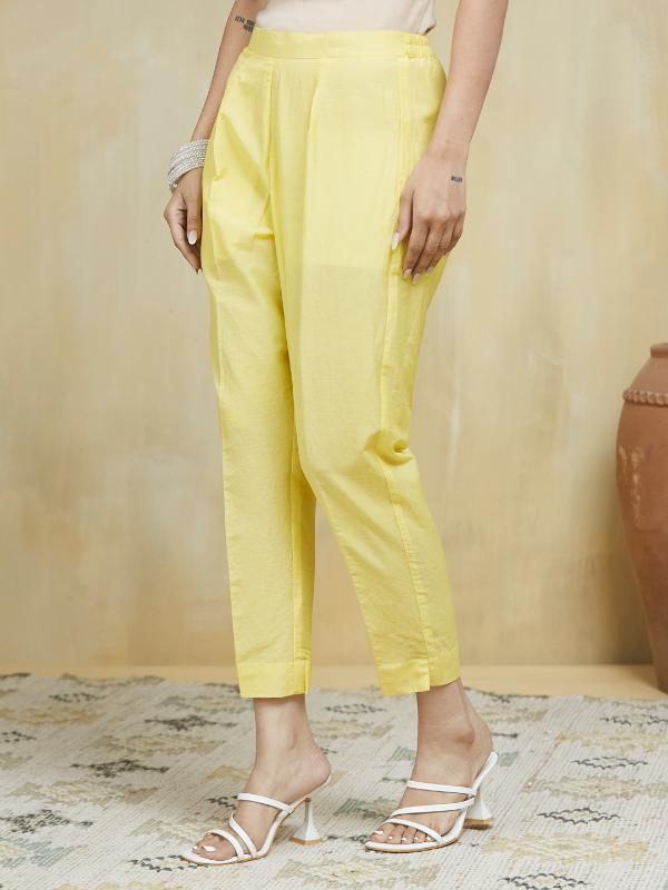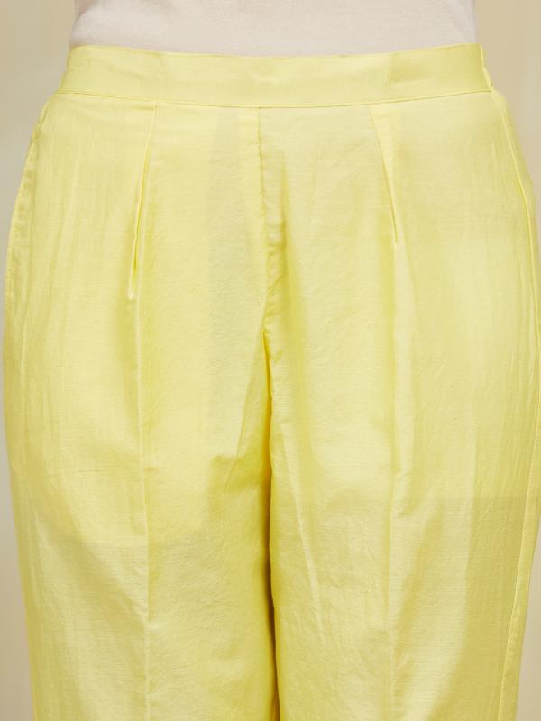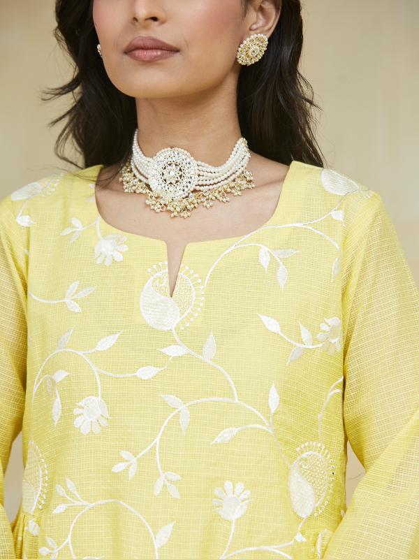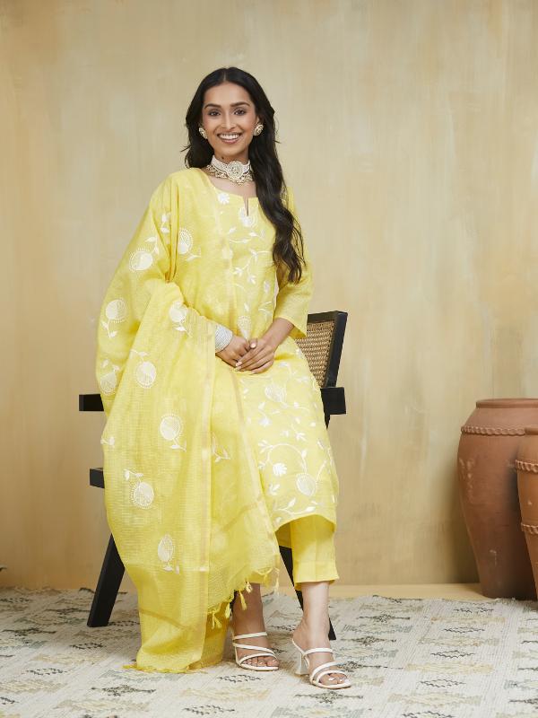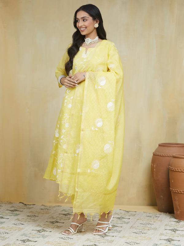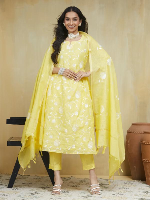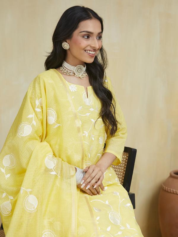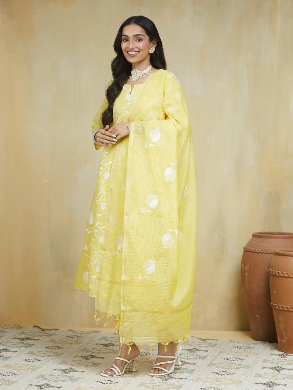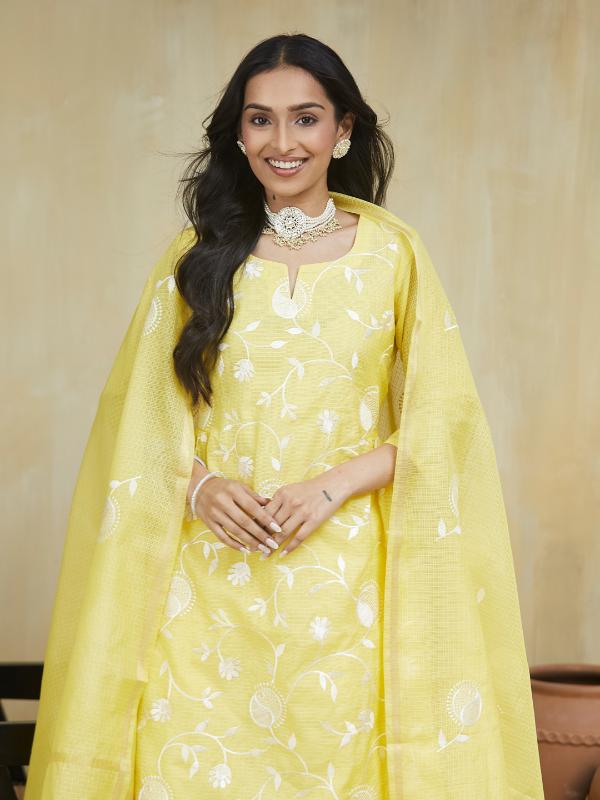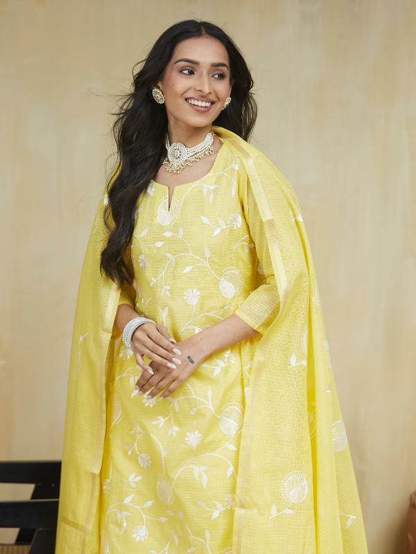 This Kota Doria yellow salwar suit features round V neckline paired with straight pants. The look has been completed by the addition of an embroidered dupatta finished with tassels.