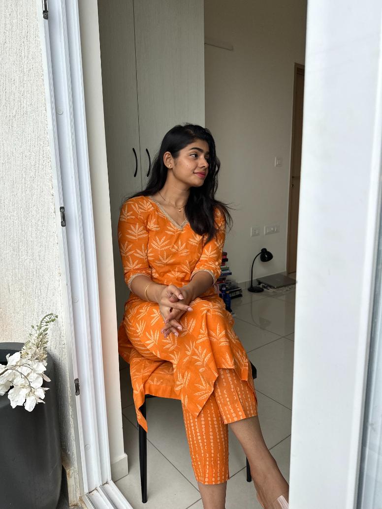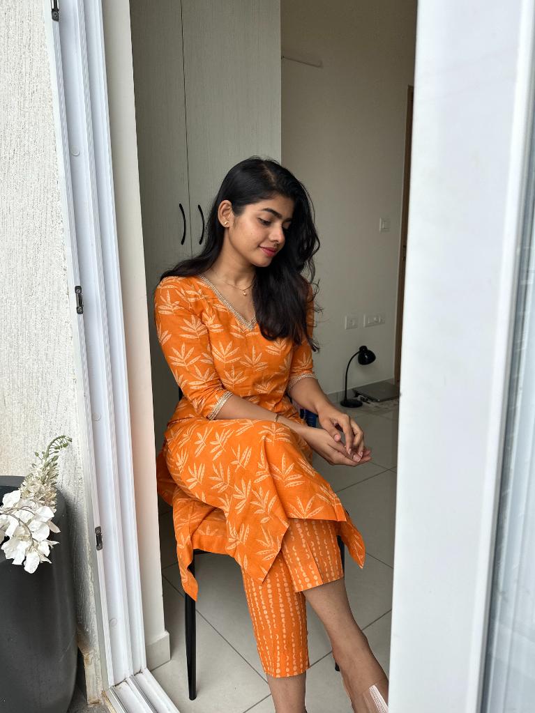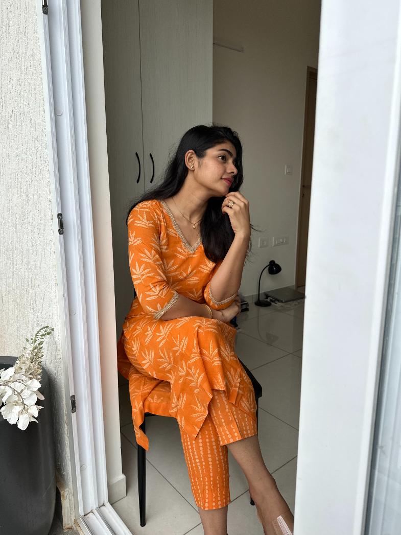 This cotton hand block printed orange kurta is paired with straight pant. The kurta has 3/4th sleeves & the V neck and sleeves are highlighted with rosegold lace .