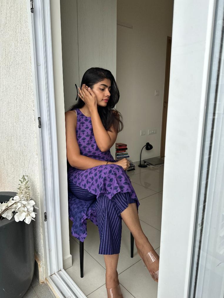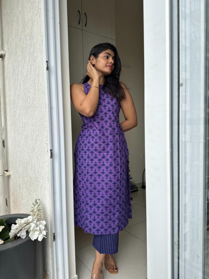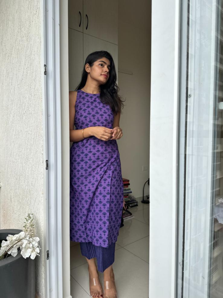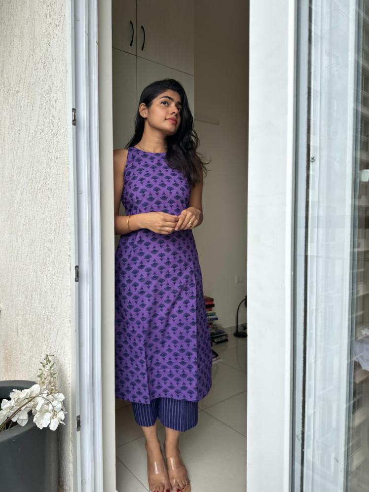 This cotton hand block printed purple kurta is paired with straight pallazo. The kurta has closed neckline with a back opening.