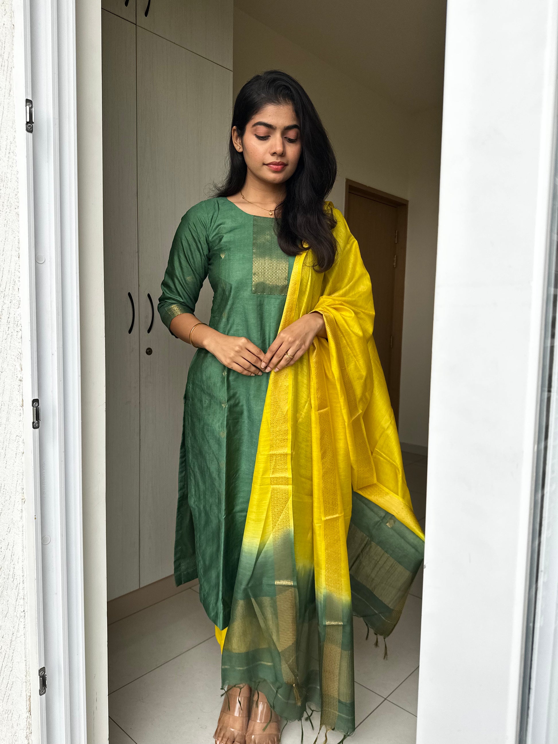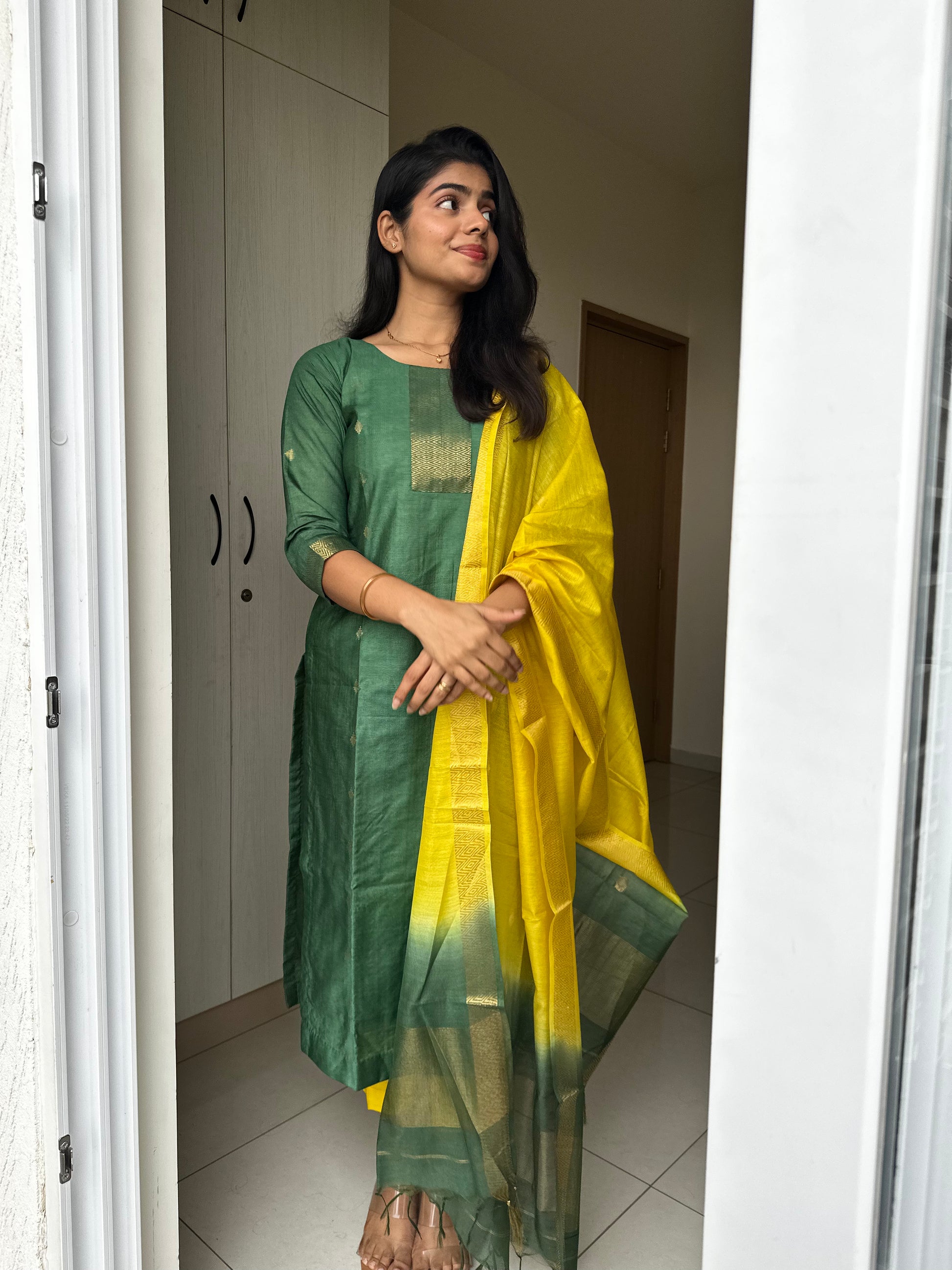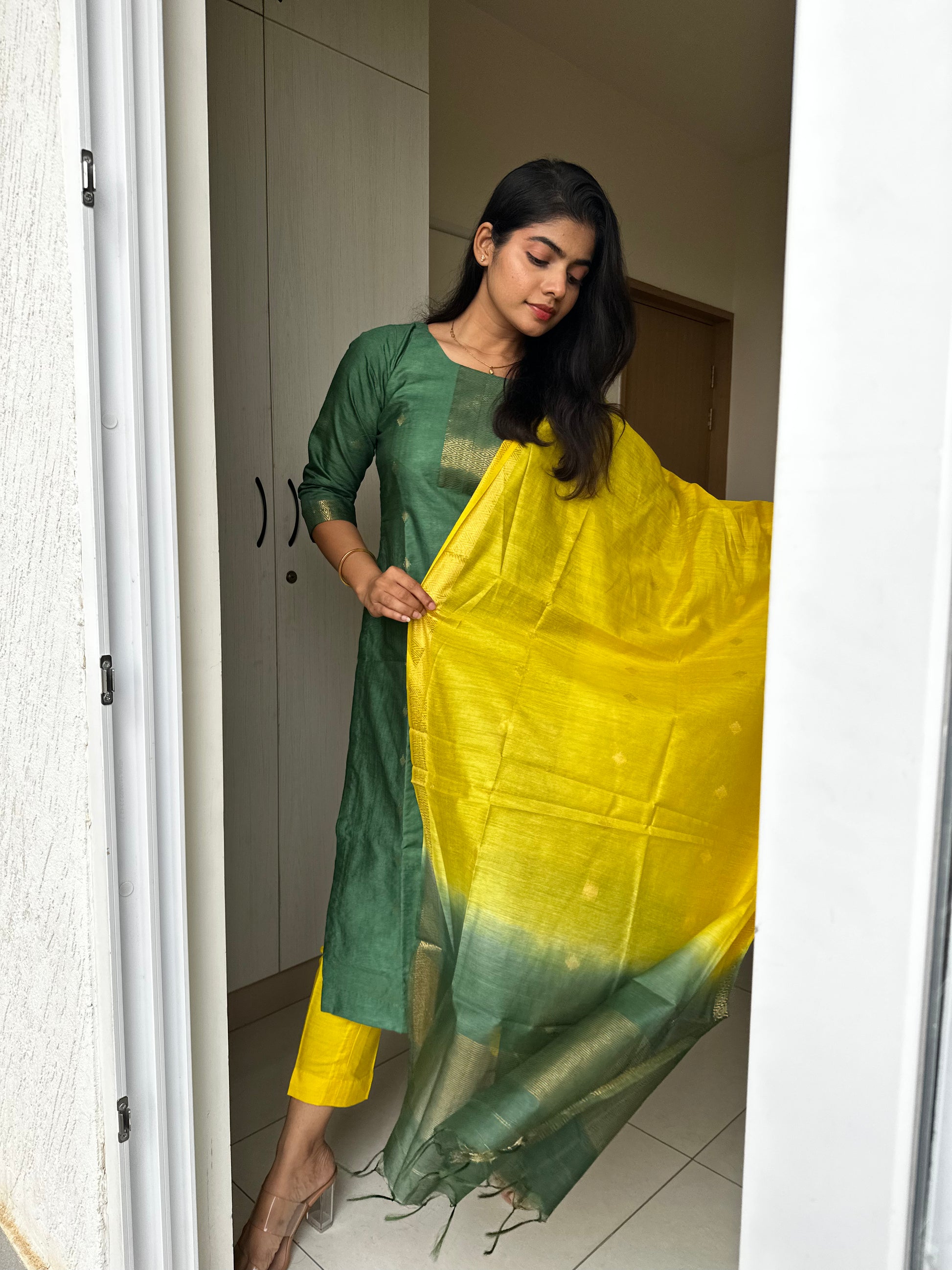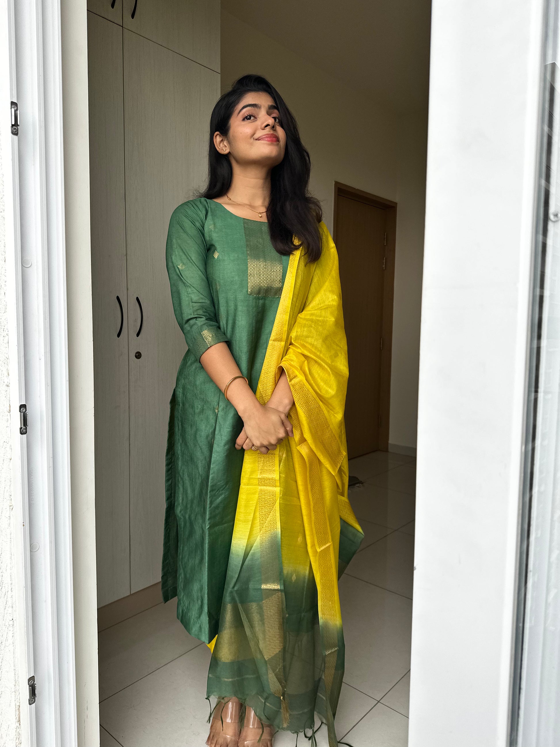 This salwar suit features U neckline with a high neck paired with straight pants. The look has been completed by addition of an elegant double shaded katan silk dupatta with mangalgiri zari border that has been finished with tassels.