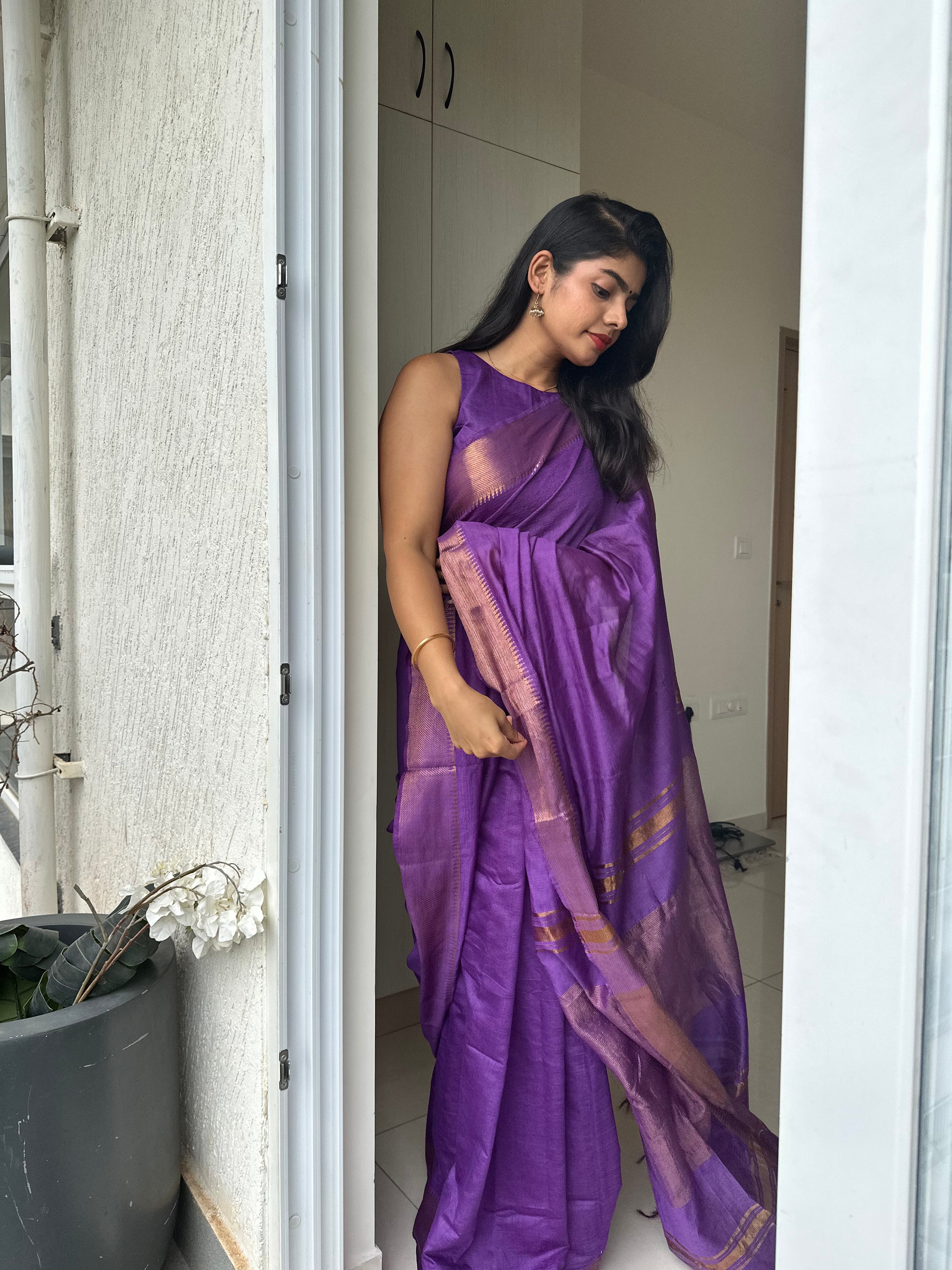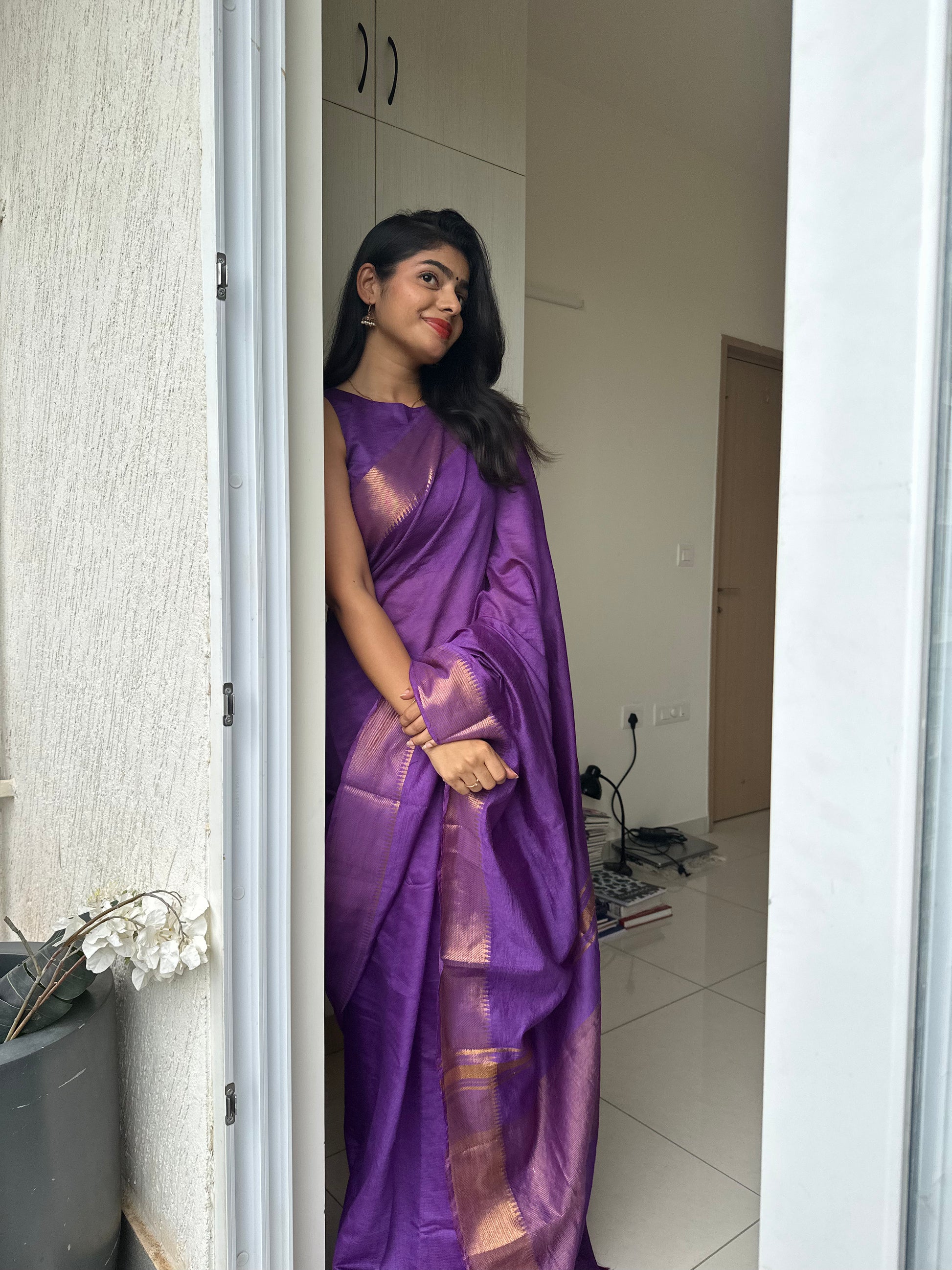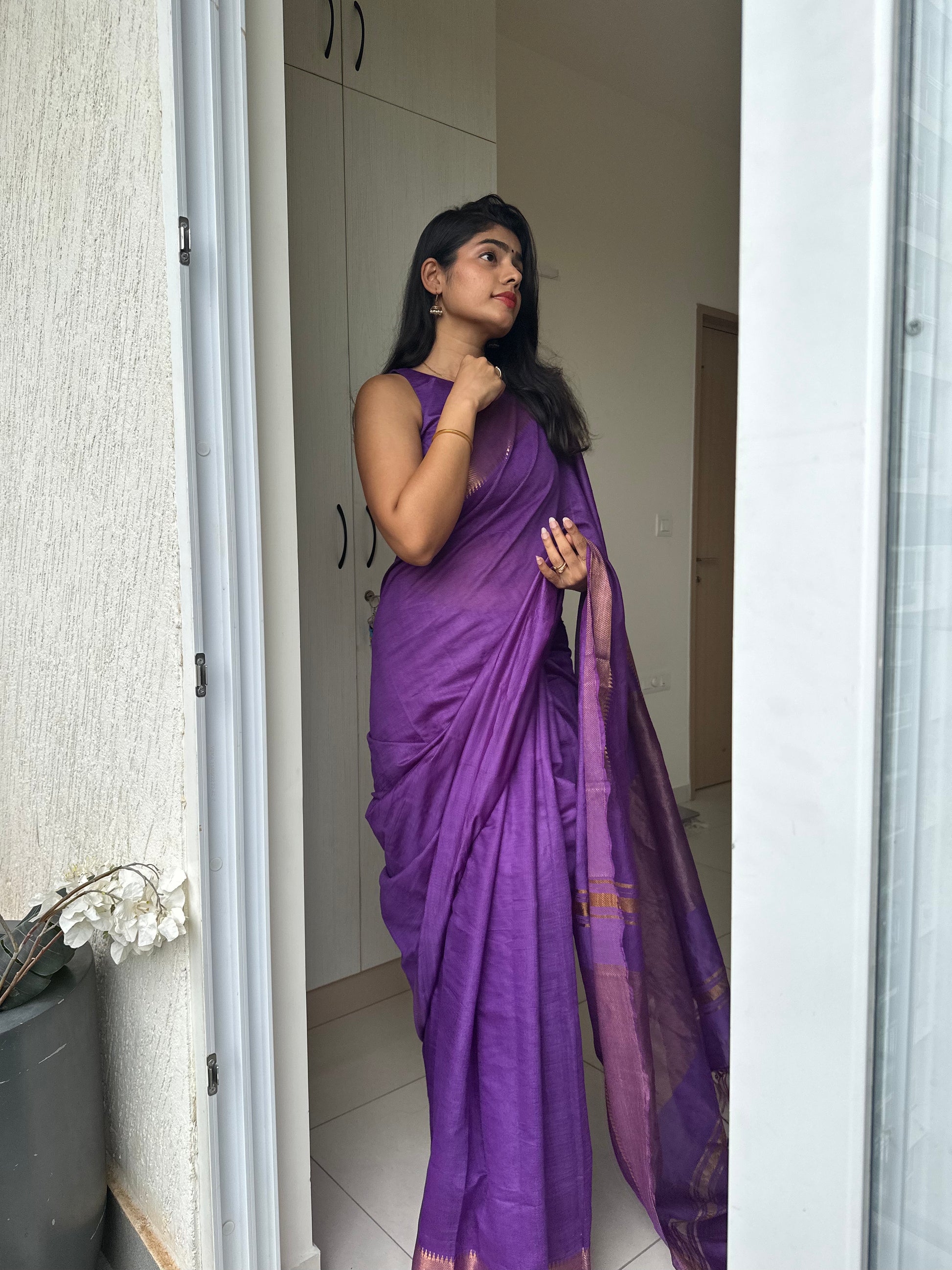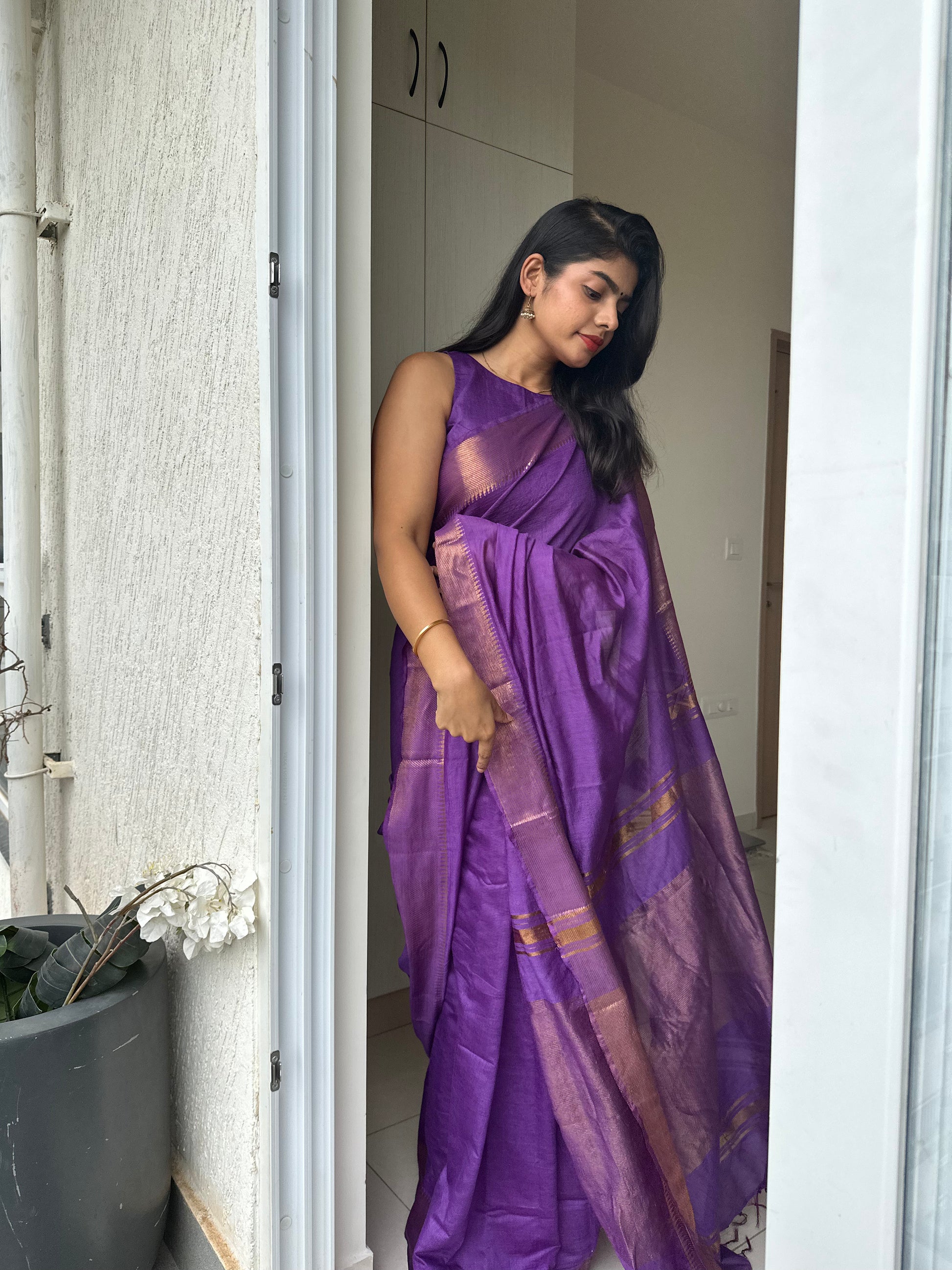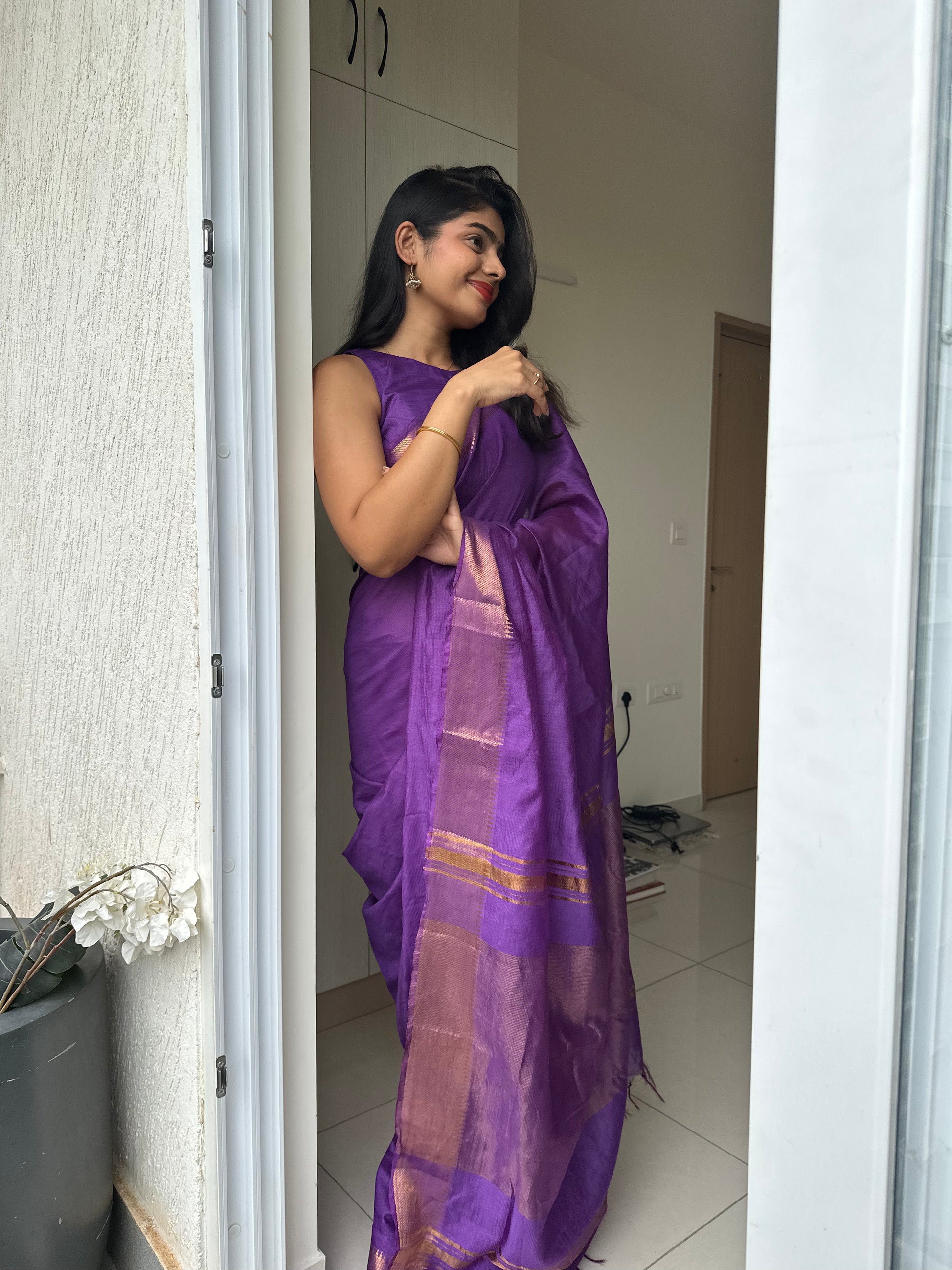 This mangalgiri silk saree has copper border running all throughout. It comes with a boat neck princess cut blouse that looks perfect.