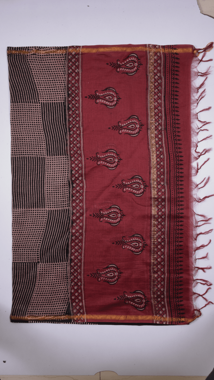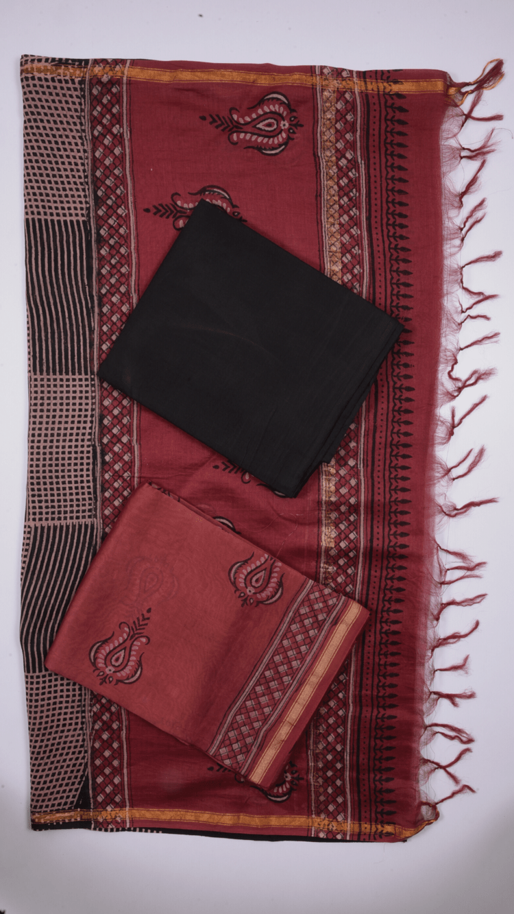 బ్లాక్ ప్రింటెడ్ చందేరీ అన్-స్టిచ్డ్ సూట్