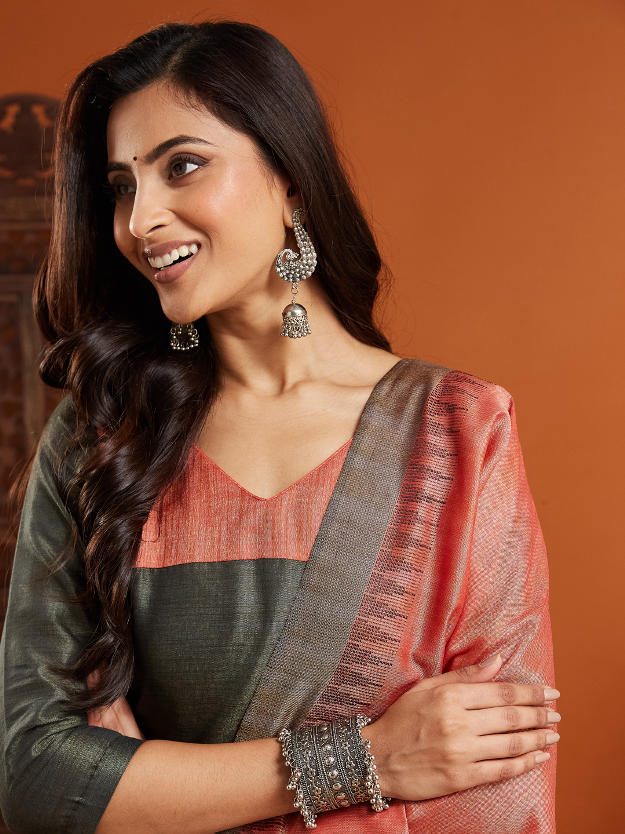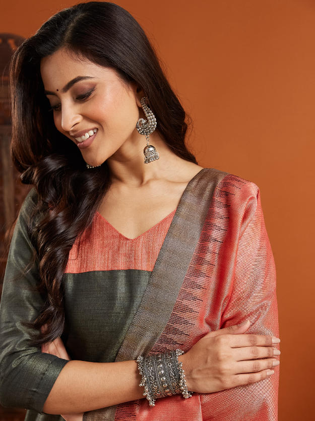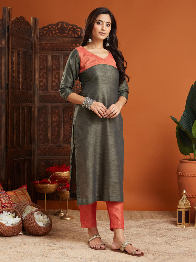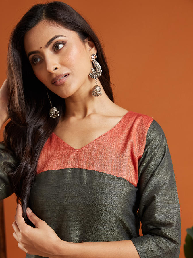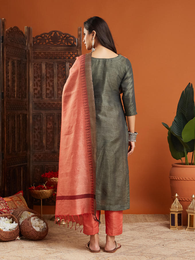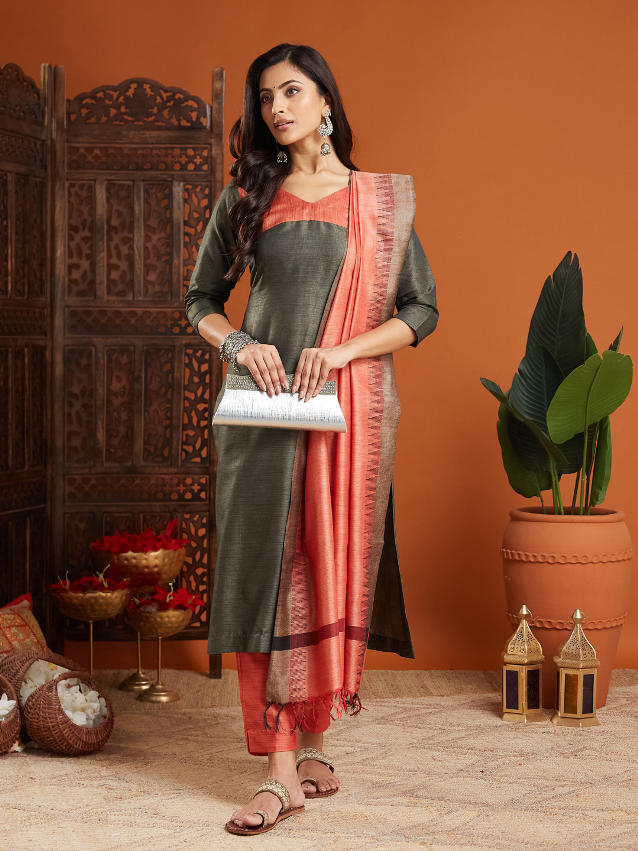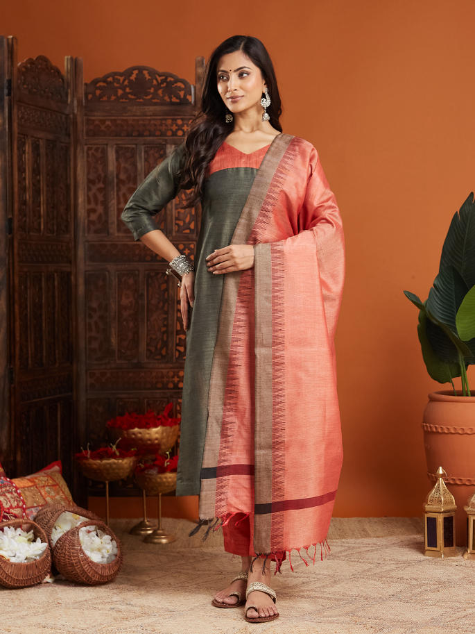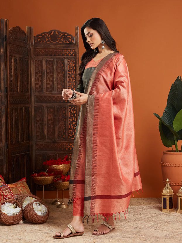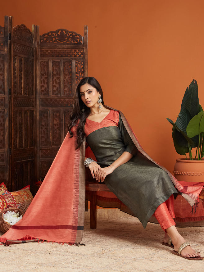 ఈ కాటన్ జ్యూట్ సిల్క్ హ్యాండ్ నేసిన సల్వార్ సూట్ స్ట్రెయిట్ ప్యాంట్లతో జత చేయబడిన V నెక్లైన్ను కలిగి ఉంది. టెంపుల్ బార్డర్తో కూడిన స్టేట్మెంట్ డబుల్-షేడెడ్ దుపట్టాను జోడించడం ద్వారా ఈ లుక్ పూర్తయింది, దీనిని టాసెల్స్తో పూర్తి చేశారు.